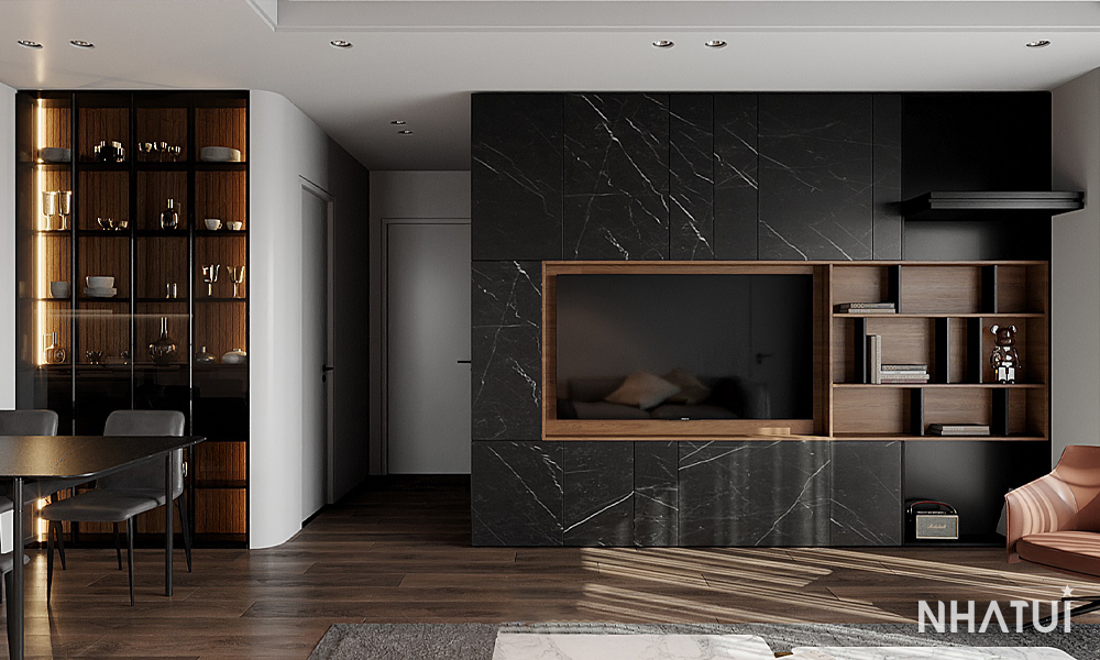 Bước vào căn hộ, điểm gây choáng ngợp đầu tiên chính là hệ vách TV được ốp toàn bộ bằng đá Marble đen vân mây.