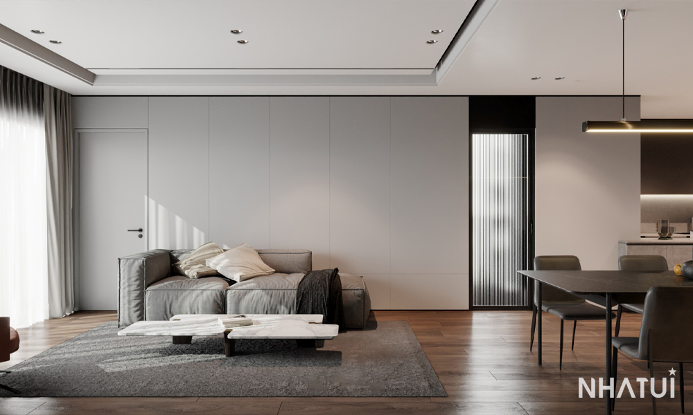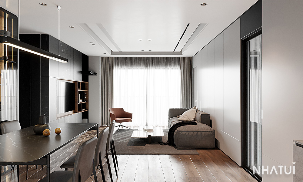 Sự kết nối giữa phòng khách và bếp là điểm cộng lớn trong mặt bằng 86m2 này. NHÀ TUI đã khéo léo sử dụng các tông màu trung tính (Xám, Trắng, Đen) để làm sợi dây liên kết.