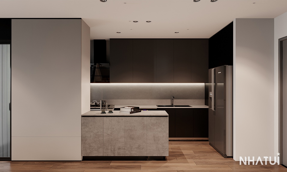 Đảo bếp & Tủ bếp: Sử dụng chất liệu Laminate giả đá bê tông tạo sự đồng bộ. Hệ tủ bếp phẳng, không tay nắm giúp không gian trở nên cực kỳ gọn gàng.