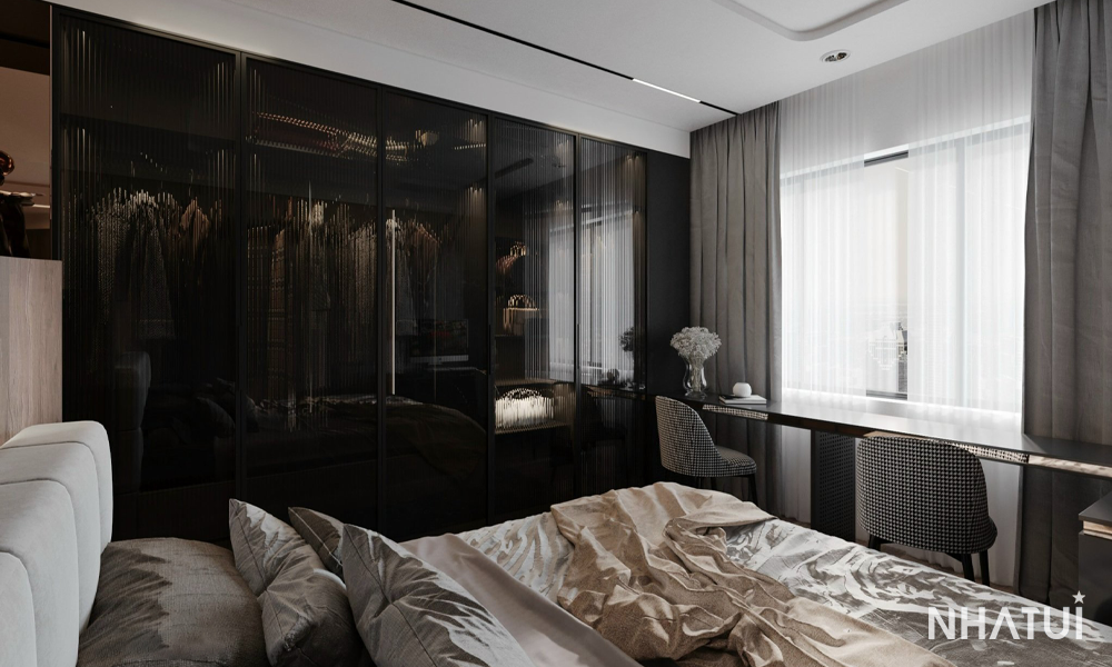 Bố cục: Tủ quần áo cánh kính hoặc âm tường được sử dụng để tiết kiệm diện tích nhưng vẫn giữ được vẻ đẳng cấp.