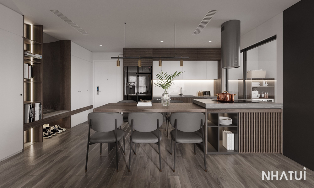 Đảo bếp kết hợp bàn ăn vừa tiết kiệm diện tích, vừa tăng công năng sử dụng