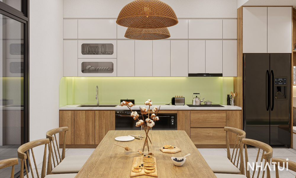 Bàn ăn gỗ ấm áp, đèn thả trang trí tạo điểm nhấn