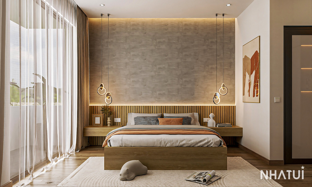 Giường gỗ thấp, đầu giường ốp nan gỗ kết hợp tường hiệu ứng bê tông