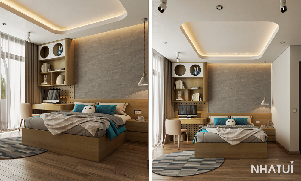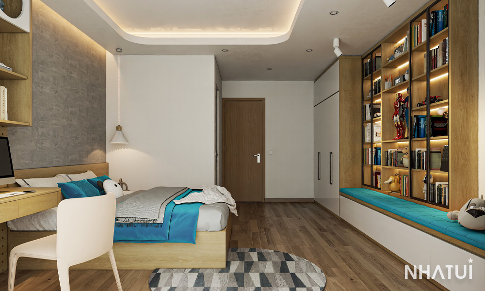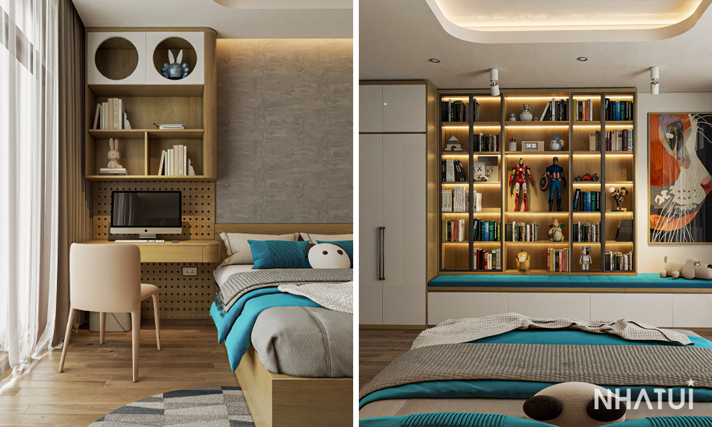 Nội thất tích hợp: giường, bàn học, tủ sách